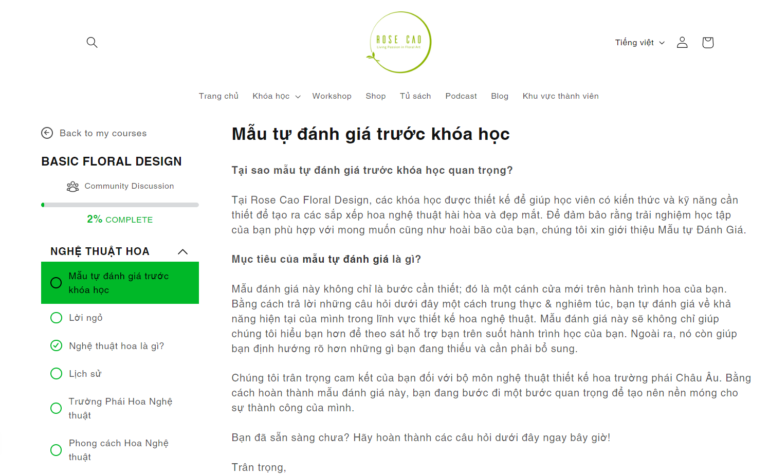 Sau khi hoàn thành các học phần phía trên và hoàn thành mẫu đánh giá cuối khóa (giúp học viên đánh giá tiến bộ và sự nắm vững kiến thức đã học). Bạn sẽ nhận được chứng chỉ hoàn thành khóa học cấp bởi Rose Cao Floral Design.